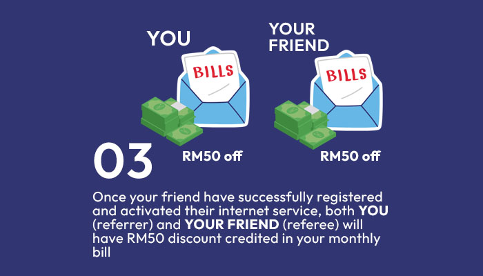 - The Referrer can receive RM50 off your internet bill for each successful referral. There is no limit to the number of referrals the referrer can submit.